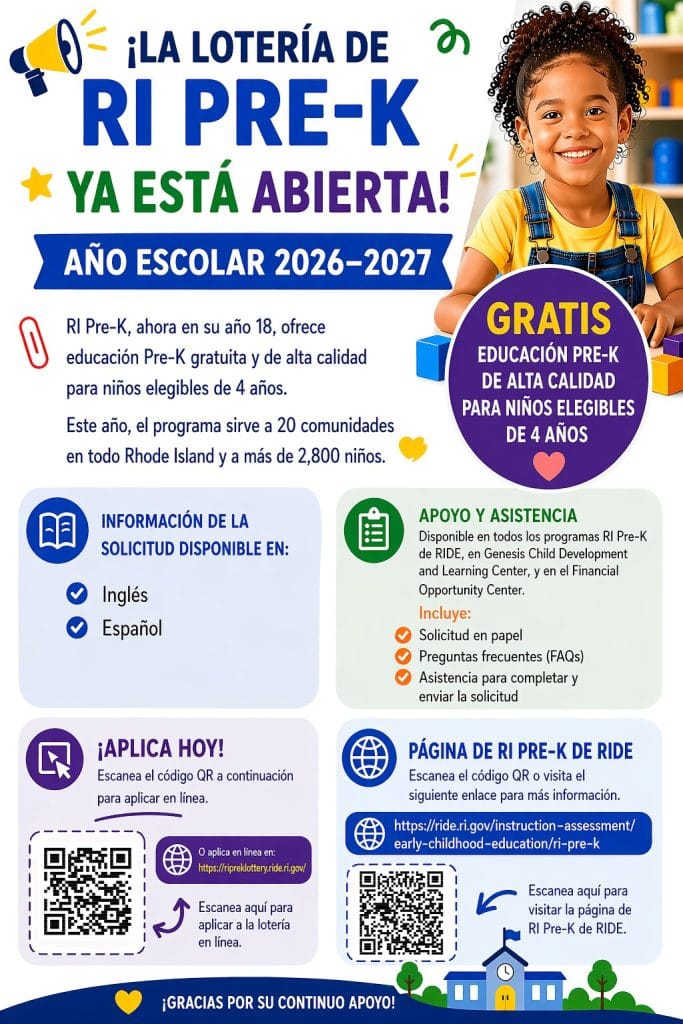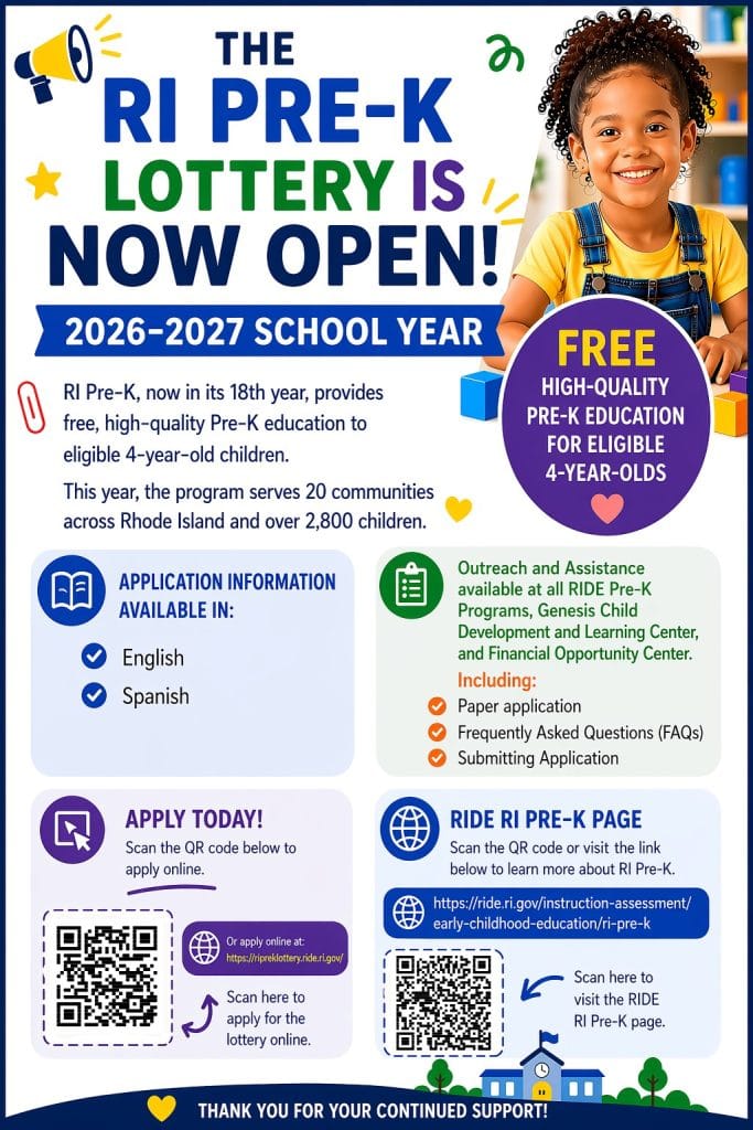 We are excited to spread the word and encourage everyone to participate. The RI Pre-K Lottery is Open! If you have a child who will be 4 years old by September 1, 2026, they may be eligible for this incredible opportunity.